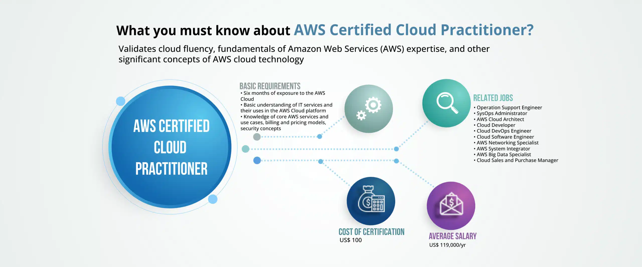 IT experts note that professionals typically experience a 20% salary hike after acquiring AWS Cloud Practitioner certification. According to salary surveys on platforms like Glassdoor, professionals with this certification can earn approximately US$119,000 annually. However, salary expectations may vary by region, industry, and experience level. Additionally, advancing to higher-level certifications can further boost your earning potential, with salaries increasing as you progress through the AWS certification ladder (from foundational to associate and professional levels).